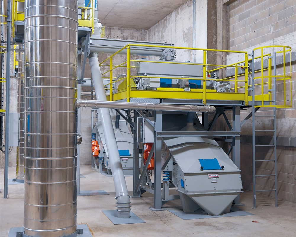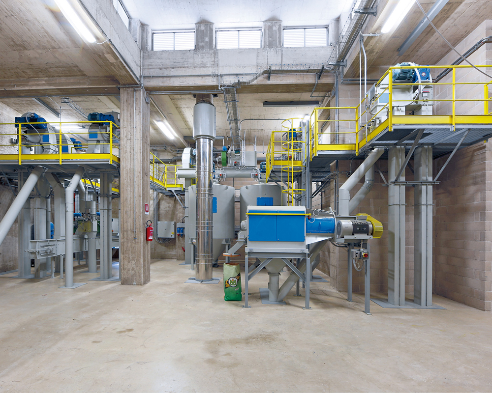• Grinding line with double roller mill, equipped with vibrating screens for selecting the grinded product.