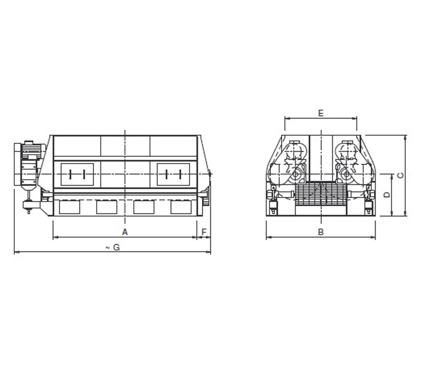 Модель A B C D E F G Полезный объем м3 Мощность кВт Скорость об/мин Вес кг