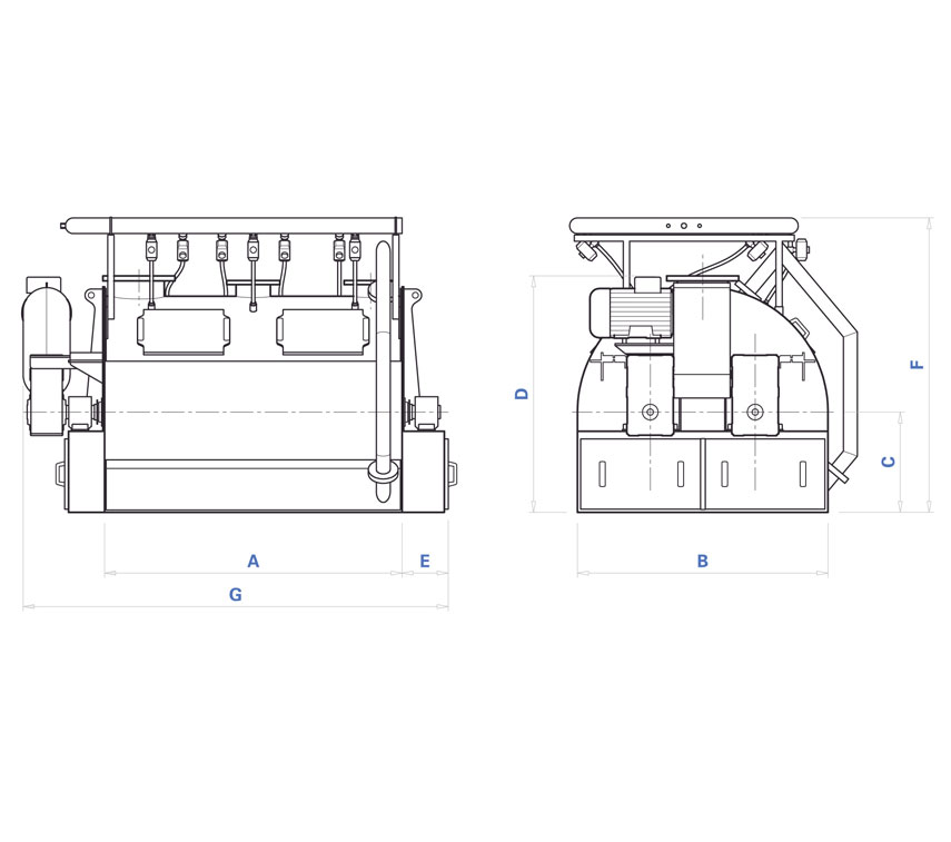Модель A B C D E F G Полезный объем м3 Мощность кВт Скорость об/мин Вес кг